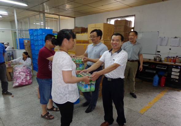【概要描述】高(gāo)溫伏暑送清涼,真情慰問暖人心。8月7日上午,市工業産業工會主任石興軍、金茂化工醫藥集團工會主席包慶傑在公司領導程開勇、王桂明等同志的(de)陪同下,深入公司生産車間,慰問炎炎夏日堅守生産一(yī)線的(de)工人,并送去(qù)防暑降溫清涼飲品。